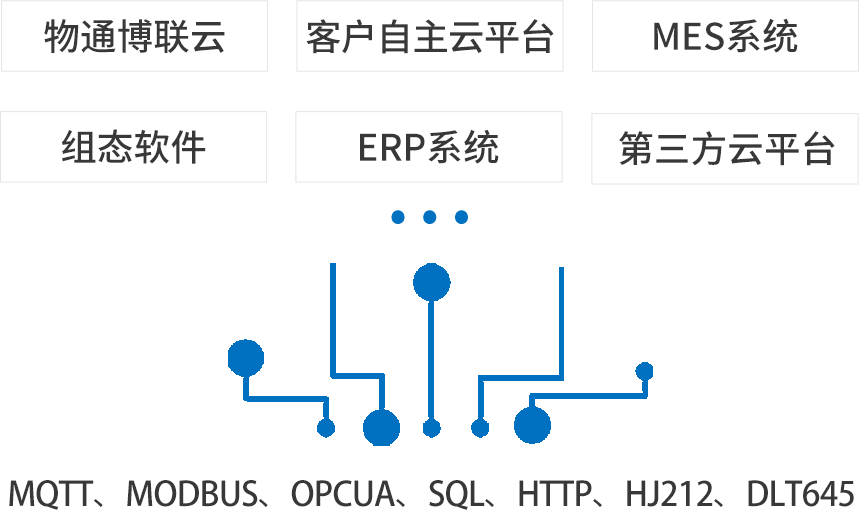 北向支持接入物通博聯(lián)云平臺,客戶自主開發(fā)的云平臺,第三方云平臺(根云、美云、華為、阿里、百度、微軟等IOT云平臺),組態(tài)軟件、MES系統(tǒng)、行業(yè)監(jiān)控平臺等工業(yè)軟件