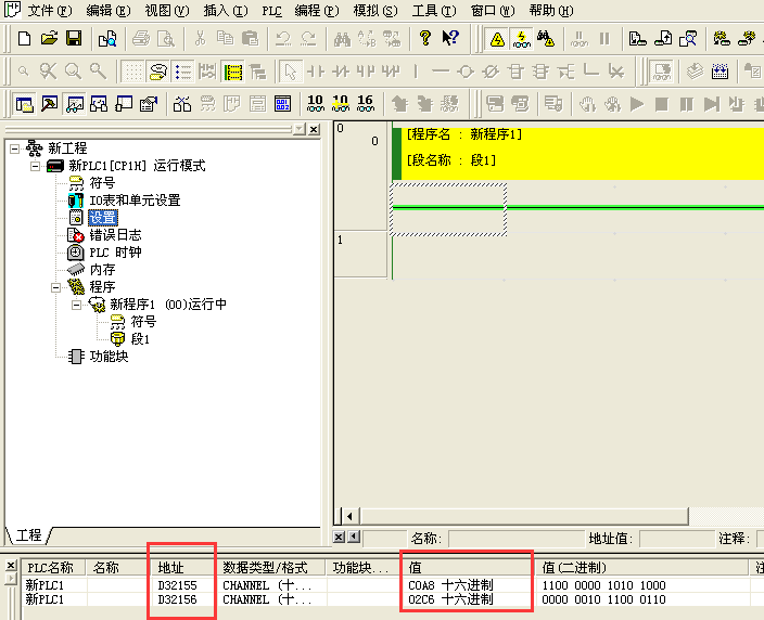 啟動(dòng)CX-P,打開(kāi)菜單欄中的PLC---自動(dòng)在線---USB連接,連接成功后,打開(kāi)菜單欄中的視圖---窗口---查看,輸入地址:D32155、D32156,將查詢得出的十六進(jìn)制的值換算成十進(jìn)制的值,就是CP1W-CIF41選件板的IP地址(C0A802C6=192.168.2.198)。