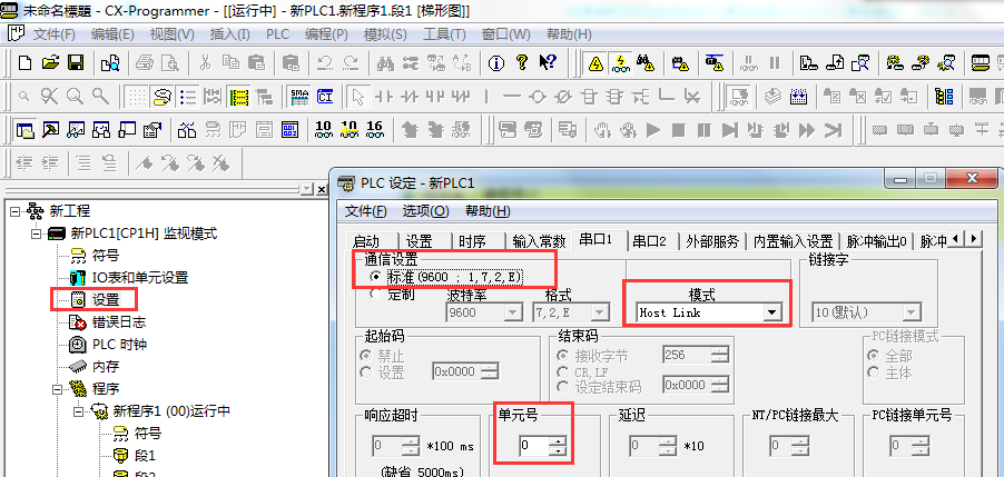 電腦與CH1P通過(guò)編程線直連后,啟動(dòng)CX-P,打開(kāi)菜單欄中的PLC---自動(dòng)在線---USB連接,連接成功后,打開(kāi)設(shè)置,設(shè)置串口參數(shù)(單元號(hào)、波特率、數(shù)據(jù)位、停止位、奇偶校驗(yàn)、通信模式),如下圖所示: