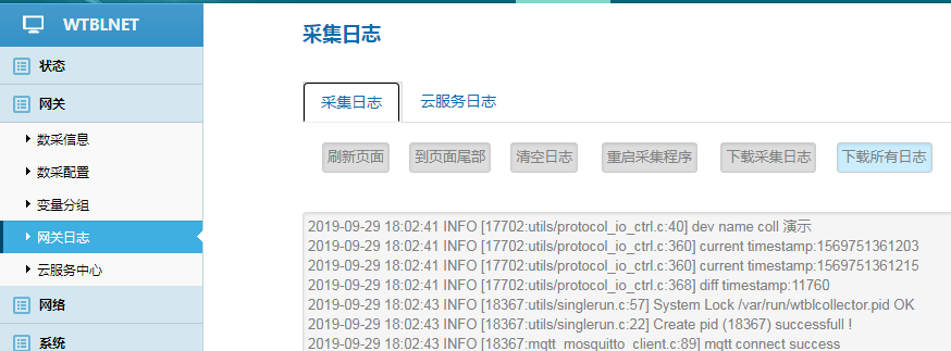 網(wǎng)關(guān)運(yùn)行出現(xiàn)異常時(shí),請(qǐng)將日志狀態(tài)調(diào)整為:調(diào)試。下載網(wǎng)關(guān)日志發(fā)送至物通博聯(lián)技術(shù)支持工程師處診斷。