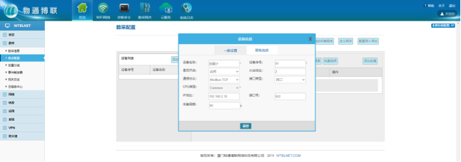 在網(wǎng)關(guān)Web頁面點(diǎn)擊數(shù)采配置——添加設(shè)備,配置通信協(xié)議以及通信參數(shù)。