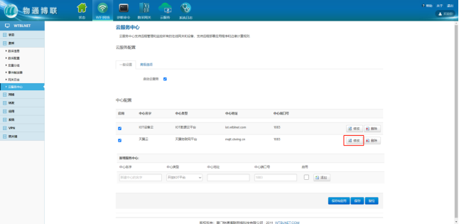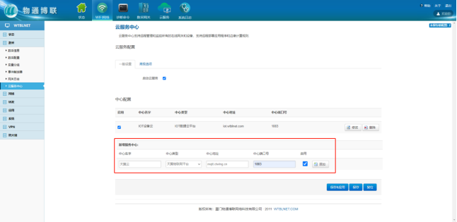 打開物通博聯(lián)網(wǎng)關(guān)Web界面==>點(diǎn)擊云服務(wù)==>中心類型選擇天翼物聯(lián)網(wǎng)平臺(tái)==>輸入相應(yīng)信息==>勾選啟用==>點(diǎn)擊”添加”。