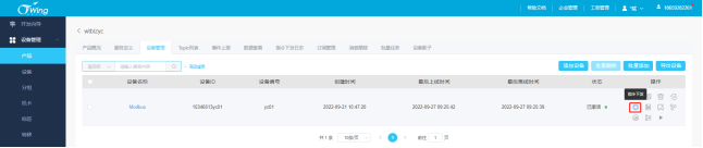 在產(chǎn)品——設(shè)備管理頁面對(duì)設(shè)備進(jìn)行操作,點(diǎn)擊“指令下發(fā)”