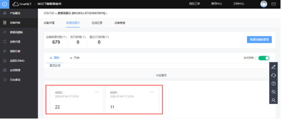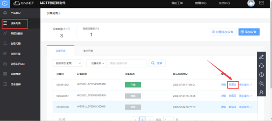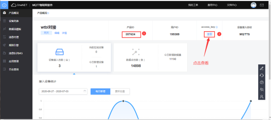 可進(jìn)入OneNET平臺的對應(yīng)產(chǎn)品中獲取網(wǎng)關(guān)云服務(wù)中心所需要填寫的ID和KEY。