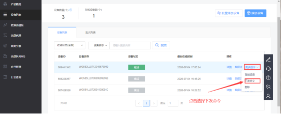 可以在設(shè)備列表中選擇對應(yīng)網(wǎng)關(guān)更多操作中的下發(fā)命令