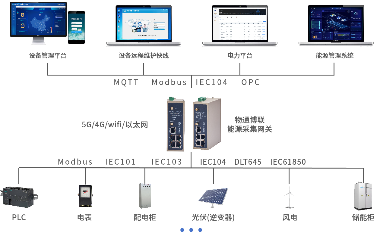 物通博聯(lián)能源采集網(wǎng)關(guān)可以連接水、電、氣、熱等能源設(shè)備和PLC,支持Modbus、IEC101、IEC103、IEC104、DLT645、IEC61850等協(xié)議,采集能源數(shù)據(jù)上傳到能源管理系統(tǒng)或數(shù)據(jù)中心進(jìn)行分析和監(jiān)控,實(shí)時(shí)監(jiān)控各種能源設(shè)備的運(yùn)行狀態(tài)和能源消耗情況,及時(shí)發(fā)現(xiàn)和解決能源浪費(fèi)和設(shè)備故障等問題,提高能源管理效率。