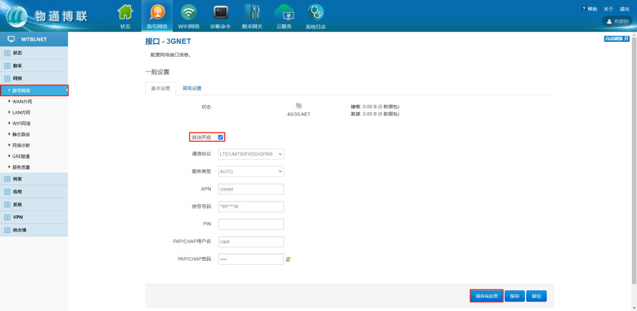 下載中心 視頻中心 常見問題 售后服務(wù) 工業(yè)網(wǎng)關(guān) 設(shè)備快線 數(shù)據(jù)云平臺(tái) 聯(lián)網(wǎng)設(shè)備 問答百科 工業(yè)智能網(wǎng)關(guān)如何使用流量卡上網(wǎng)? 時(shí)間:2022-10-26 09:15:30 點(diǎn)擊:5588 關(guān)鍵詞:工業(yè)網(wǎng)關(guān),流量卡,網(wǎng)關(guān)配置 問題:工業(yè)智能網(wǎng)關(guān)如何使用流量卡上網(wǎng)? 回答: (1)電腦通過網(wǎng)線接入到網(wǎng)關(guān)LAN口,瀏覽器輸入192.168.2.1默認(rèn)地址 (2)登陸到網(wǎng)關(guān)配置界面,點(diǎn)擊網(wǎng)絡(luò)—撥號(hào)網(wǎng)絡(luò)—自動(dòng)開啟—保存應(yīng)用 上一篇:工業(yè)智能網(wǎng)關(guān)如何連接wifi熱點(diǎn)? 下一篇: 工業(yè)智能網(wǎng)關(guān)如何使用網(wǎng)線上網(wǎng)?