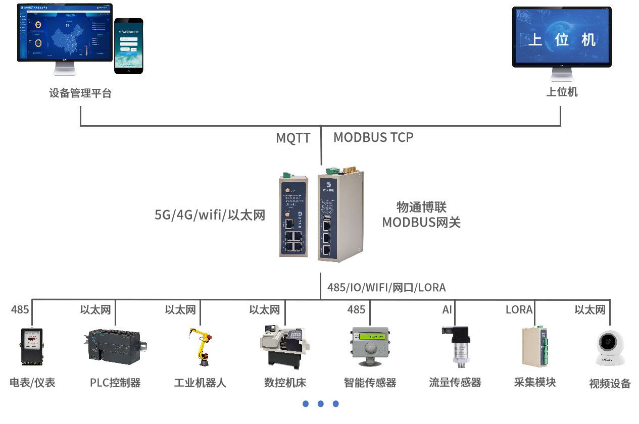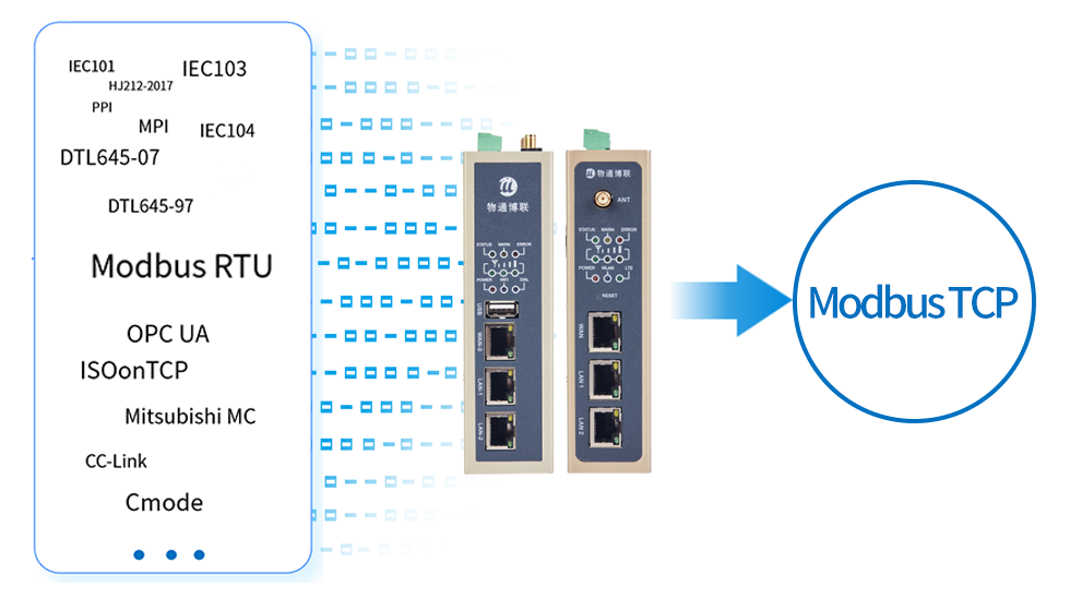 物通博聯(lián)Modbus網(wǎng)關(guān)是一款支持采集各種Modbus RTU和Modbus TCP協(xié)議設(shè)備的數(shù)據(jù),經(jīng)過網(wǎng)關(guān)的邊緣計算和數(shù)據(jù)標(biāo)準(zhǔn)化后通過MQTT協(xié)議上傳到各種云平臺和軟件;同時支持將各種非Modbus協(xié)議的工業(yè)設(shè)備數(shù)據(jù)(如PLC、儀器儀表、傳感器等)轉(zhuǎn)化為Modbus 協(xié)議對接給上位機(jī)軟件或者平臺實(shí)現(xiàn)數(shù)據(jù)互通互聯(lián)。