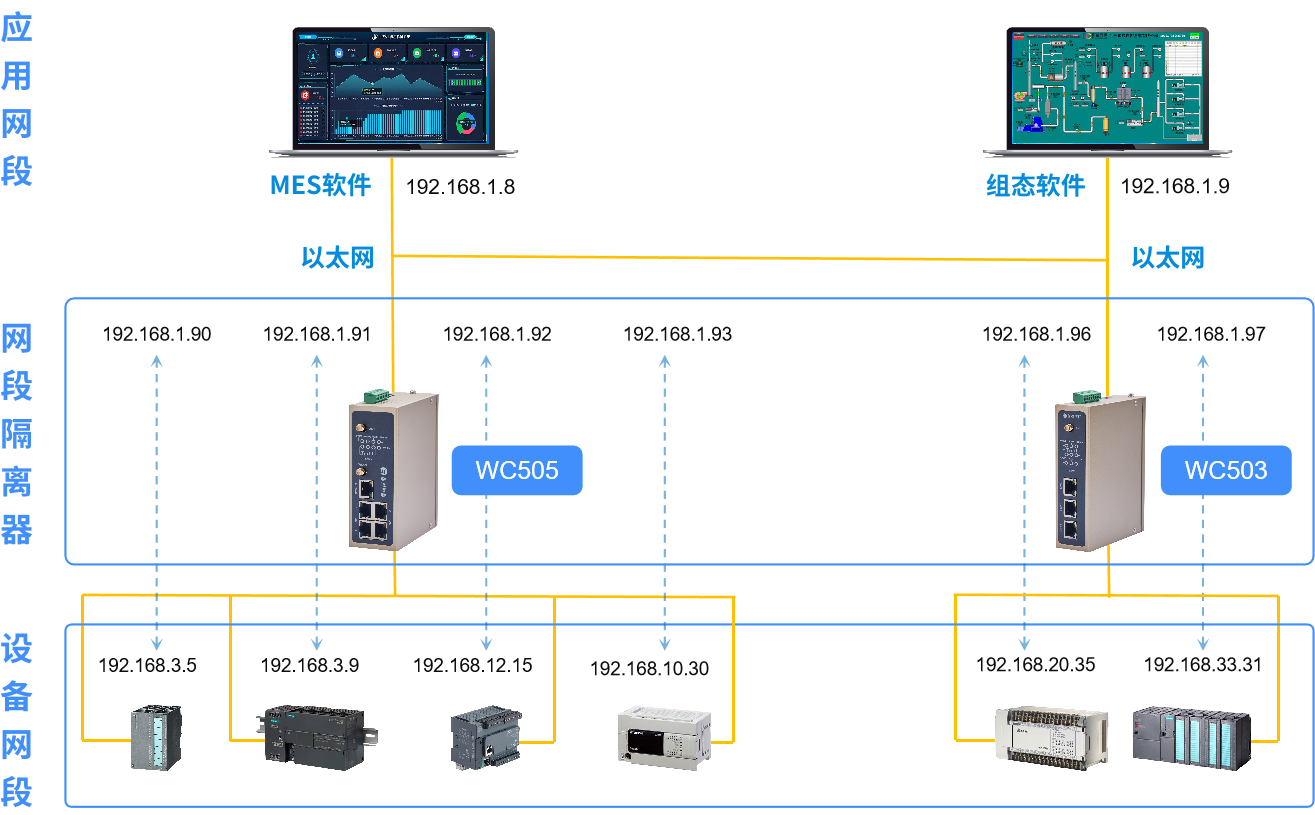 物通博聯(lián)WC系列網(wǎng)段隔離器適用于生產(chǎn)網(wǎng)絡(luò)對(duì) PLC、HMI、CNC、DCS、MES等網(wǎng)絡(luò)通訊和數(shù)據(jù)采集,兼有跨網(wǎng)段隔離和IP轉(zhuǎn)換的功能。車間多個(gè)設(shè)備,如果有不同網(wǎng)段的IP地址,則可以統(tǒng)一成同一網(wǎng)段的IP地址,進(jìn)行設(shè)備(PLC、CNC)的在線編程、數(shù)據(jù)采集、遠(yuǎn)程管理等各種跨網(wǎng)段訪問(wèn)。