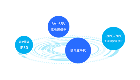支持6V~35V寬電壓供電,-20℃~70℃工業(yè)級寬溫設(shè)計,抗電磁干擾,適應(yīng)更多對供電要求和溫度要求的應(yīng)用現(xiàn)場。