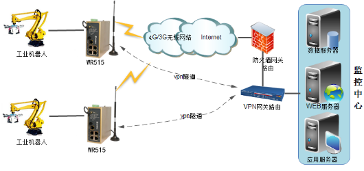 監(jiān)控中心端采用ADSL/光纖接入Internet 公網(wǎng),獲取固定公網(wǎng)ip。搭建vpn服務(wù)器。物通博聯(lián)工業(yè)無線路由WR515做vpn客戶端和服務(wù)器建立vpn隧道,實(shí)現(xiàn)兩端內(nèi)網(wǎng)互通。數(shù)據(jù)庫(kù)服務(wù)器上運(yùn)行采集系統(tǒng),可以采集工業(yè)無線路由WR515下接的以太網(wǎng)plc數(shù)據(jù)以及工業(yè)機(jī)器人數(shù)據(jù),從而達(dá)到采集監(jiān)控工業(yè)機(jī)器人運(yùn)行狀態(tài)目的。