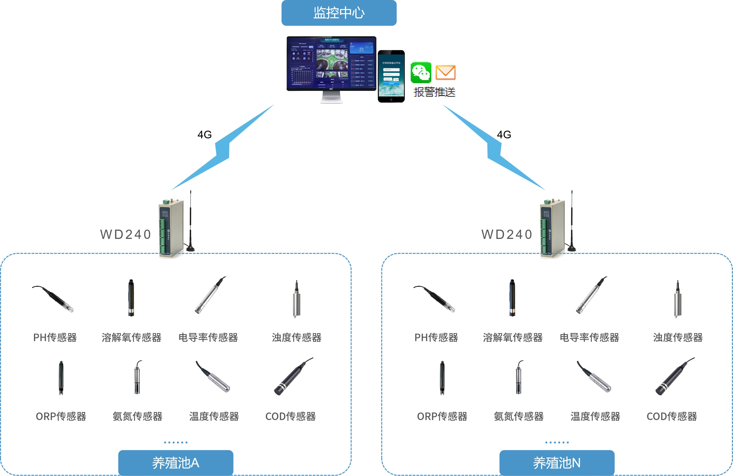 WD240數(shù)據(jù)采集終端具備多路IO數(shù)據(jù)采集和一路RS323/RS485串口,能夠接入溫濕度傳感器、pH值傳感器、溶解氧傳感器等設(shè)備,實時采集水質(zhì)參數(shù)對接到智慧養(yǎng)殖管理平臺。
