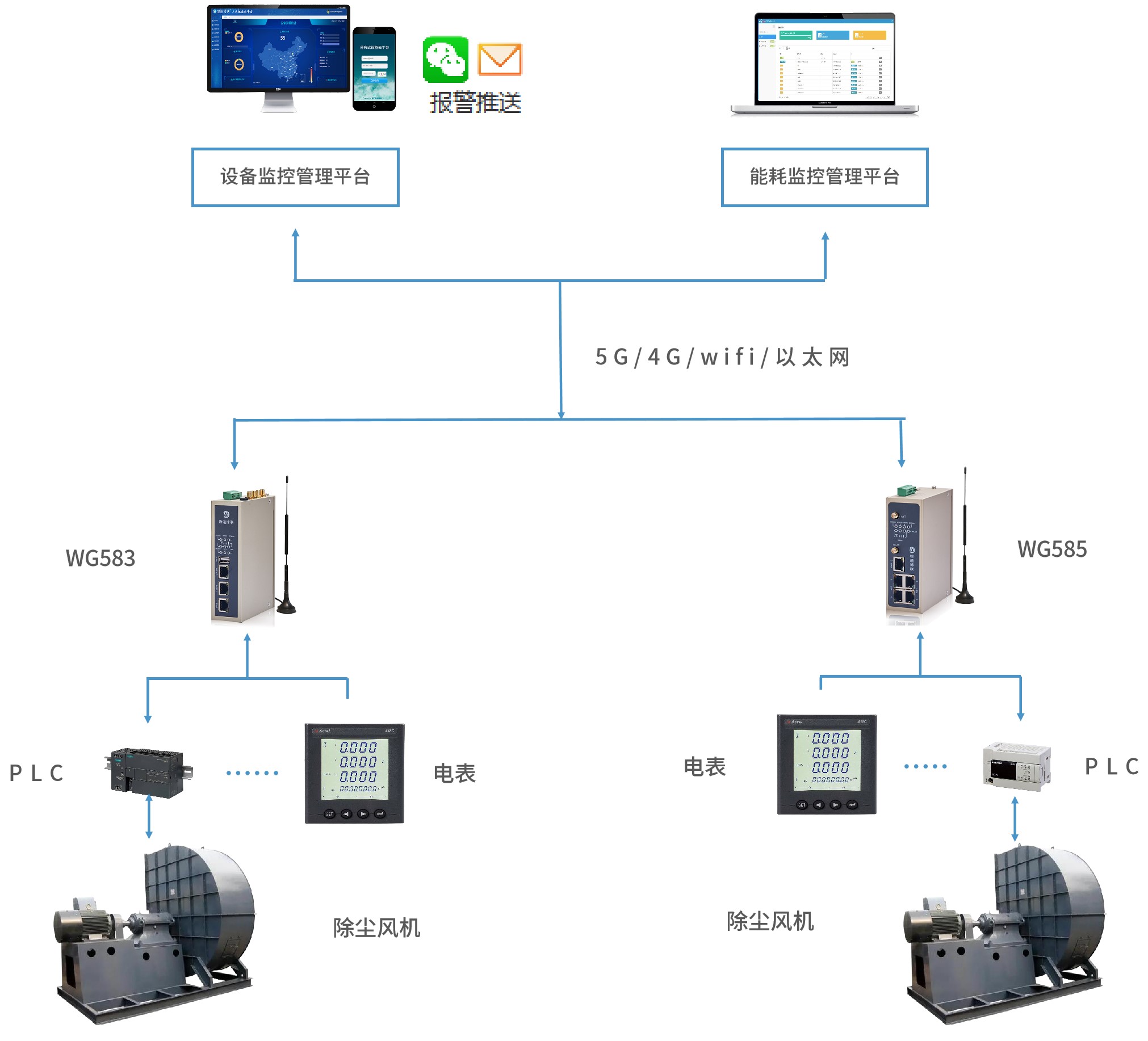 物通博聯(lián)工業(yè)智能網(wǎng)關(guān)具備多個(gè)串口/網(wǎng)口和協(xié)議解析能力,能夠接入除塵風(fēng)機(jī)PLC與智能電表等設(shè)備,實(shí)時(shí)采集設(shè)備數(shù)據(jù)并對(duì)接到本地上位機(jī)或云平臺(tái)中。