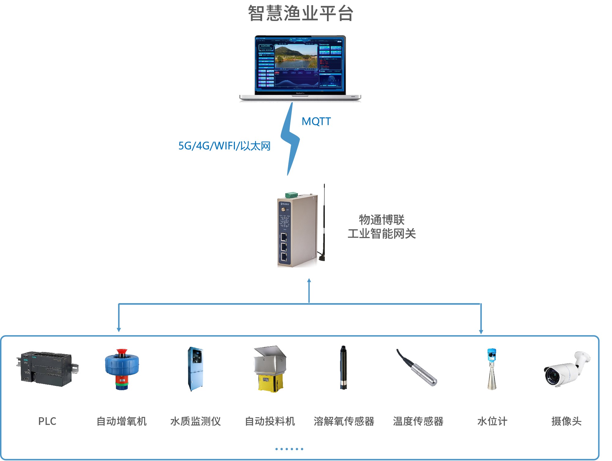 實(shí)時(shí)采集溫度傳感器、水質(zhì)監(jiān)測(cè)儀、PLC、攝像頭等設(shè)備并對(duì)接到智慧漁業(yè)云平臺(tái)或現(xiàn)場(chǎng)監(jiān)控大屏中,確保數(shù)據(jù)采集通信的安全性與完整性。